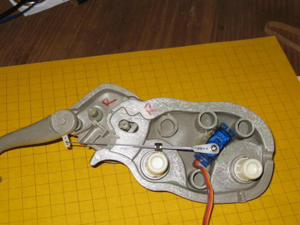 This photo shows the servo (blue object to the right) in the "down" position. The silver barrel on the wires is used to adjust the length of the control wire.