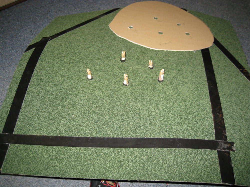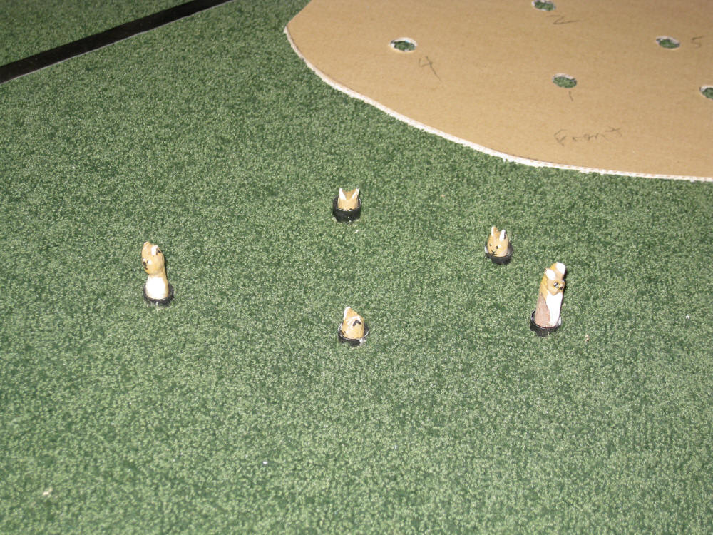 The prairie dogs are ready to be installed in the layout. In the photo below you see the cardboard template (rear) that will be used to drill the 3/4" plywood on the platform. The carpet square has been drilled and punched for the 1/2" holes through which the prairie dogs will emerge.